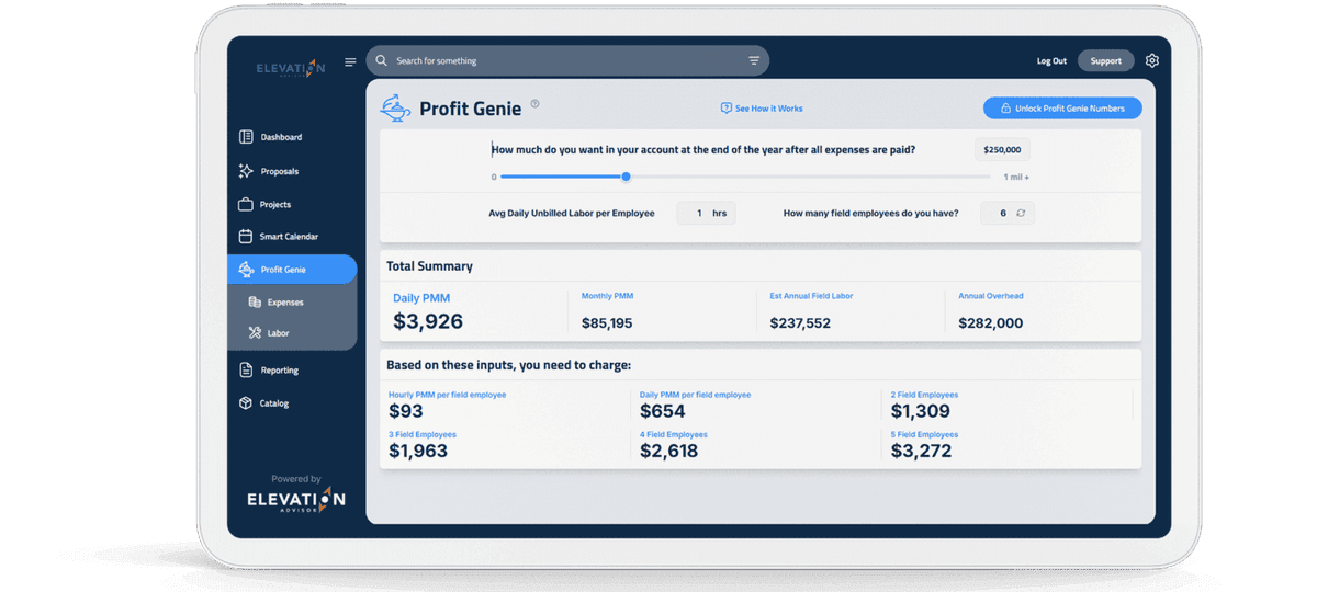 You input your numbers and let the Profit Genie reverse-engineer your financial goals into your billable rate and markup. From there, every proposal, change order, crew schedule, and invoice connects to that same goal, helping you make decisions with confidence instead of stress.