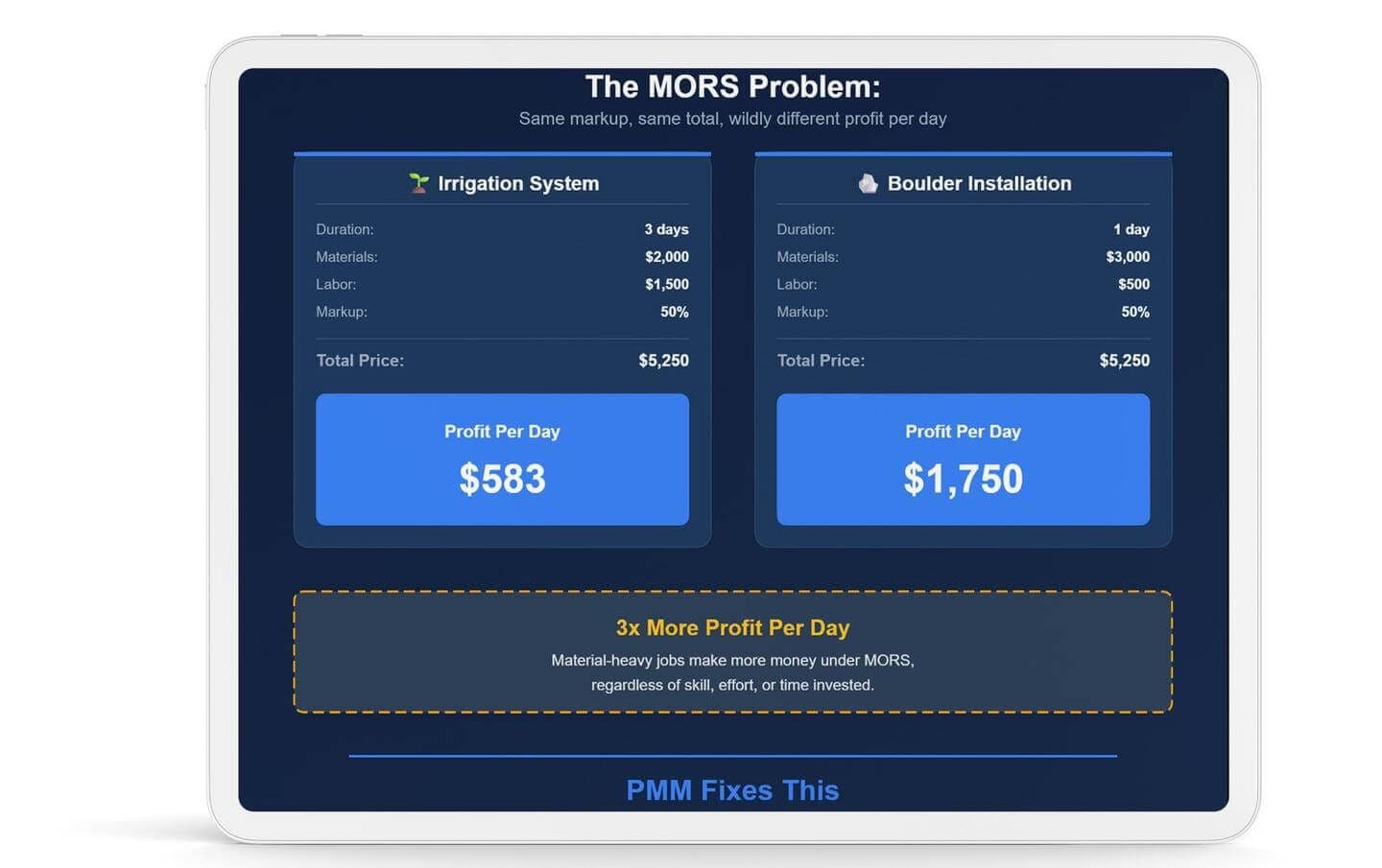 Most landscape software still uses the Multiple Overhead Recovery System (MORS), a decades-old pricing model that ties your profit to materials. You mark up labor, equipment, and materials based on projections before the year starts and hope it all balances out.
